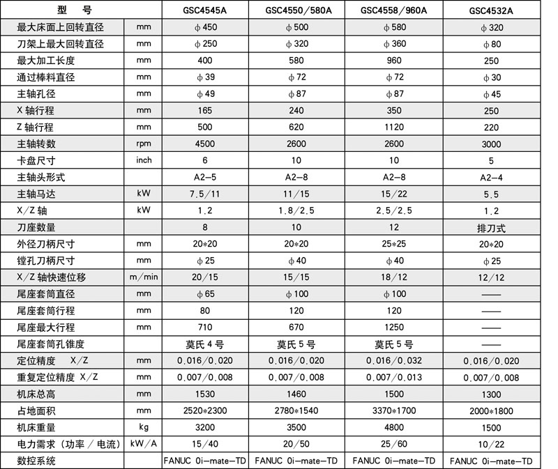 GSC45系列臥式斜床身全功能數(shù)控車床是一種中等規(guī)格、高效通用自動(dòng)化機(jī)床。該系列機(jī)床配備了先進(jìn)的FANUC 0i-Mate-TD系統(tǒng),具有CNC標(biāo)準(zhǔn)功能,同時(shí)配裝八/十/十二工位液壓轉(zhuǎn)塔刀架或排刀裝置,以滿足切削時(shí)自動(dòng)換刀需要,可完成多種工序的車削加工。該機(jī)床廣泛適用于軍工、汽車、航空、模具等制造行業(yè)的各種零件的精密加工。同時(shí)由于機(jī)床剛性好,加工精度穩(wěn)定,適合于各種軸類、盤類零件的中、大批量生產(chǎn)。 本機(jī)主軸單元為獨(dú)立主軸(套筒式),電機(jī)直連無(wú)級(jí)調(diào)速結(jié)構(gòu)?蛇x配高精度的SKF、FAG及NSK、NTN等著名品牌的主軸專用軸承,同時(shí)使用進(jìn)口專用軸承潤(rùn)滑脂,整個(gè)主軸單元精度高、剛性好。主軸經(jīng)嚴(yán)格的動(dòng)平衡測(cè)試,精度高,精度保持性良好,熱變形小。熱穩(wěn)定性佳,最高轉(zhuǎn)速可達(dá)4500RPM。 進(jìn)給系統(tǒng)全部由伺服電機(jī)直聯(lián)驅(qū)動(dòng)、剛性、精度、動(dòng)態(tài)響應(yīng)特性好。兩軸導(dǎo)軌均采用中等預(yù)壓的線性導(dǎo)軌。